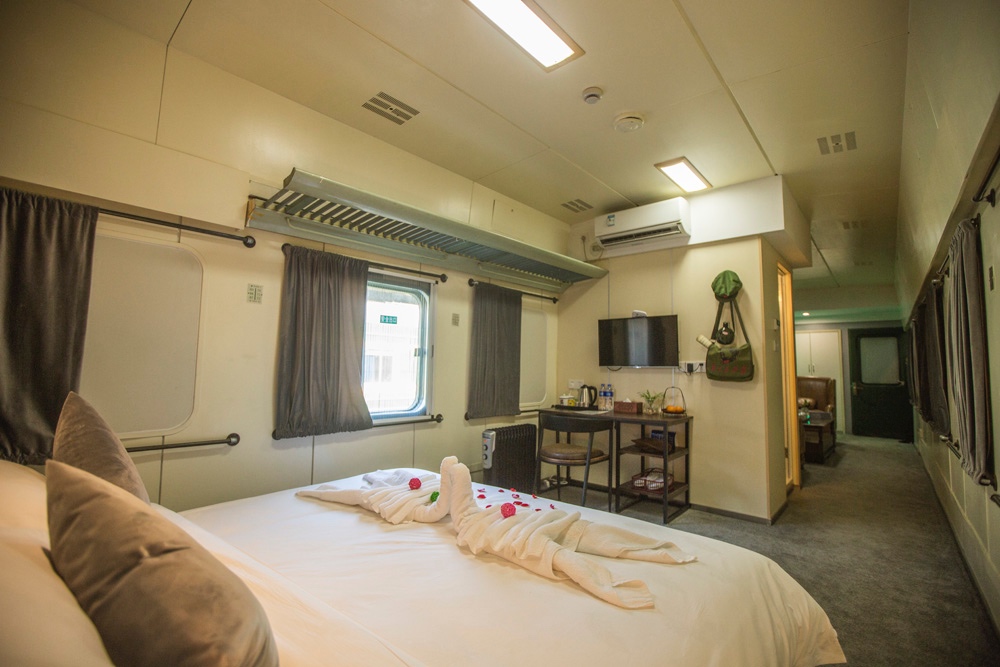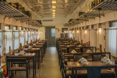 東方紅火車主題酒店由3列27節(jié)綠皮火車車廂組成,來自長春、沈陽等北方城市的綠皮火車經(jīng)過著名設(shè)計(jì)師的改造已經(jīng)成了國內(nèi)為數(shù)不多的火車主題酒店,一共73間火車客房和1個(gè)火車餐廳。酒店以橫鋼50年代金千鐵路舊址作為切入點(diǎn),利用火車枕木鋪設(shè)人行游步道,結(jié)合溫泉,形成了真正的VIP溫泉客房。走進(jìn)綠皮火車,你會(huì)發(fā)現(xiàn)原先的車廂已經(jīng)被很好地設(shè)計(jì)成了宜居的客房,書桌、衛(wèi)生間、電視、暖氣一應(yīng)俱全,還能在墻上看到年代感的背包/水壺/帽子的裝飾。