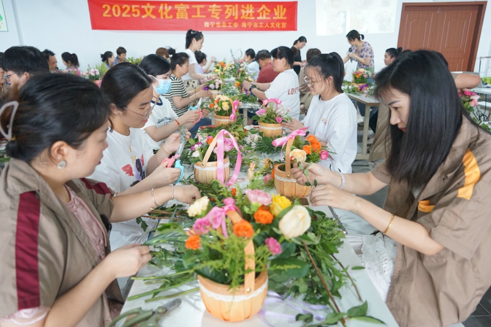 接著是“‘愛在四季?工會有約’公益培訓”——插花活動,由專業(yè)的插花老師現(xiàn)場授課教學。老師從插花的基本技巧、花材選取、顏色搭配、審美構(gòu)圖等逐一講授,并同步演示了插花全過程。大家發(fā)揮自己的想象,用心構(gòu)思、精心創(chuàng)作,在一修一剪之間,一件件細致精美、別出心裁的插花作品逐漸呈現(xiàn),沁人心脾。聞著花香,交流著心得,看著一束束原本普通、零散的花朵變成了精致的藝術(shù)作品,每個人的臉上洋溢著滿滿的成就感和幸福感。
